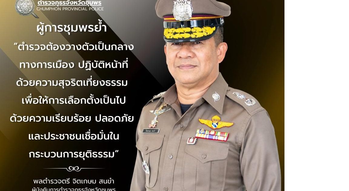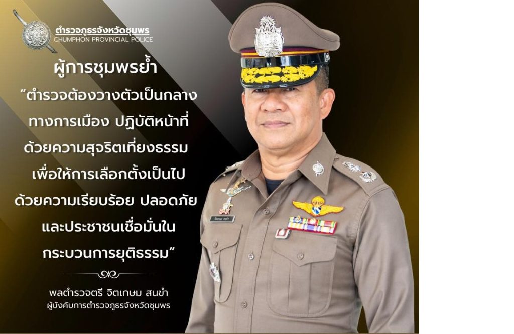 พล.ต.ต.จิตเกษม สนขำ ผบก.ภ.จว.ชุมพร ขานรับนโยบายและข้อสั่งการของผู้บัญชาการตำรวจแห่งชาติ และผู้อำนวยการศูนย์อำนวยการรักษาความปลอดภัยและความสงบเรียบร้อยการเลือกตั้ง สำนักงานตำรวจแห่งชาติ โดยกำชับให้ข้าราชการตำรวจในสังกัด ปฏิบัติหน้าที่ตามแผนรักษาความปลอดภัยและความสงบเรียบร้อยการจัดการเลือกตั้ง สำนักงานตำรวจแห่งชาติ (พิทักษ์เลือกตั้ง/66) อย่างเคร่งครัด