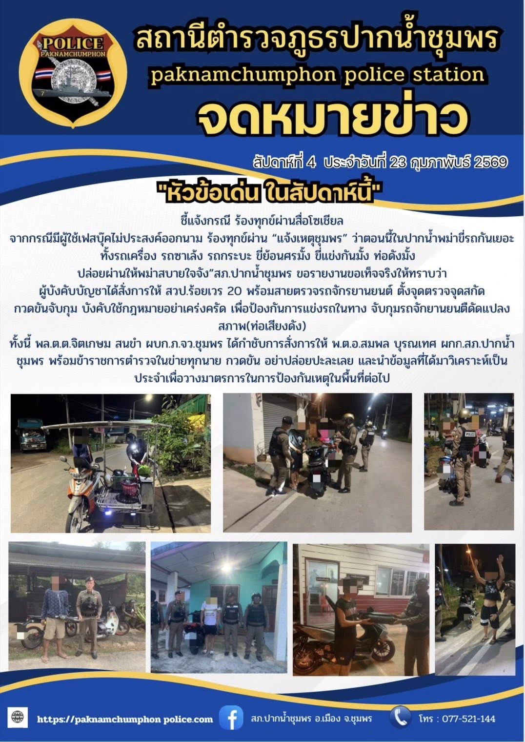 วันที่ 20 ก.พ. 2569 เวลา 09.00 น. ภายใต้การอำนวยการของ พ.ต.อ.สมพล บูรณเทศ ผกก.สภ.ปากน้ำชุมพร พ.ต.ท.ส